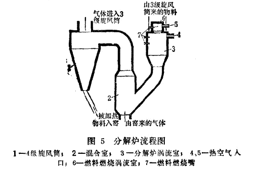 為了調(diào)整氣體動(dòng)力學(xué)制度,分解爐內(nèi)設(shè)有節(jié)流閘板,它位于混合室的圓錐形異徑管下部。分解爐工作的特性為:它完全依賴(lài)于回轉(zhuǎn)窯的操作制度。分解過(guò)的生料粉進(jìn)入渦流室同回轉(zhuǎn)窯出來(lái)的熱廢氣相混合,并依靠廢氣熱令生料粉達(dá)到85-90%的分解。從混合室出來(lái)的含生料粉的氣體進(jìn)入第四級(jí)旋風(fēng)筒,生料粉在該筒內(nèi)與氣流分開(kāi),并沿傾斜溜管進(jìn)入回轉(zhuǎn)窯內(nèi)。
