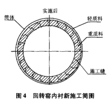 經(jīng)過(guò)與原料廠家、大修部門對(duì)該問(wèn)題的共同探討,較確定將原有兩條澆注料之間的直縫施工修改為有錯(cuò)臺(tái)的施工縫,阻擋在高溫條件下高溫炭粉由施工縫進(jìn)入輕質(zhì)料層;剞D(zhuǎn)窯內(nèi)襯新施工簡(jiǎn)圖見圖4。此項(xiàng)措施較明顯地改善了內(nèi)襯的使用狀況,次采用就使回轉(zhuǎn)窯內(nèi)襯的使用壽命提高到了440天以上。